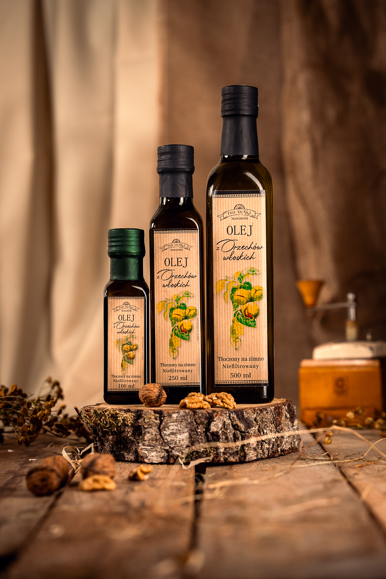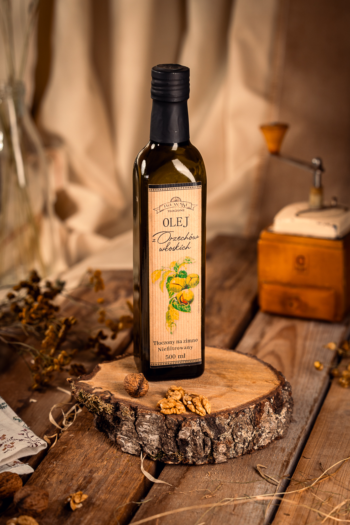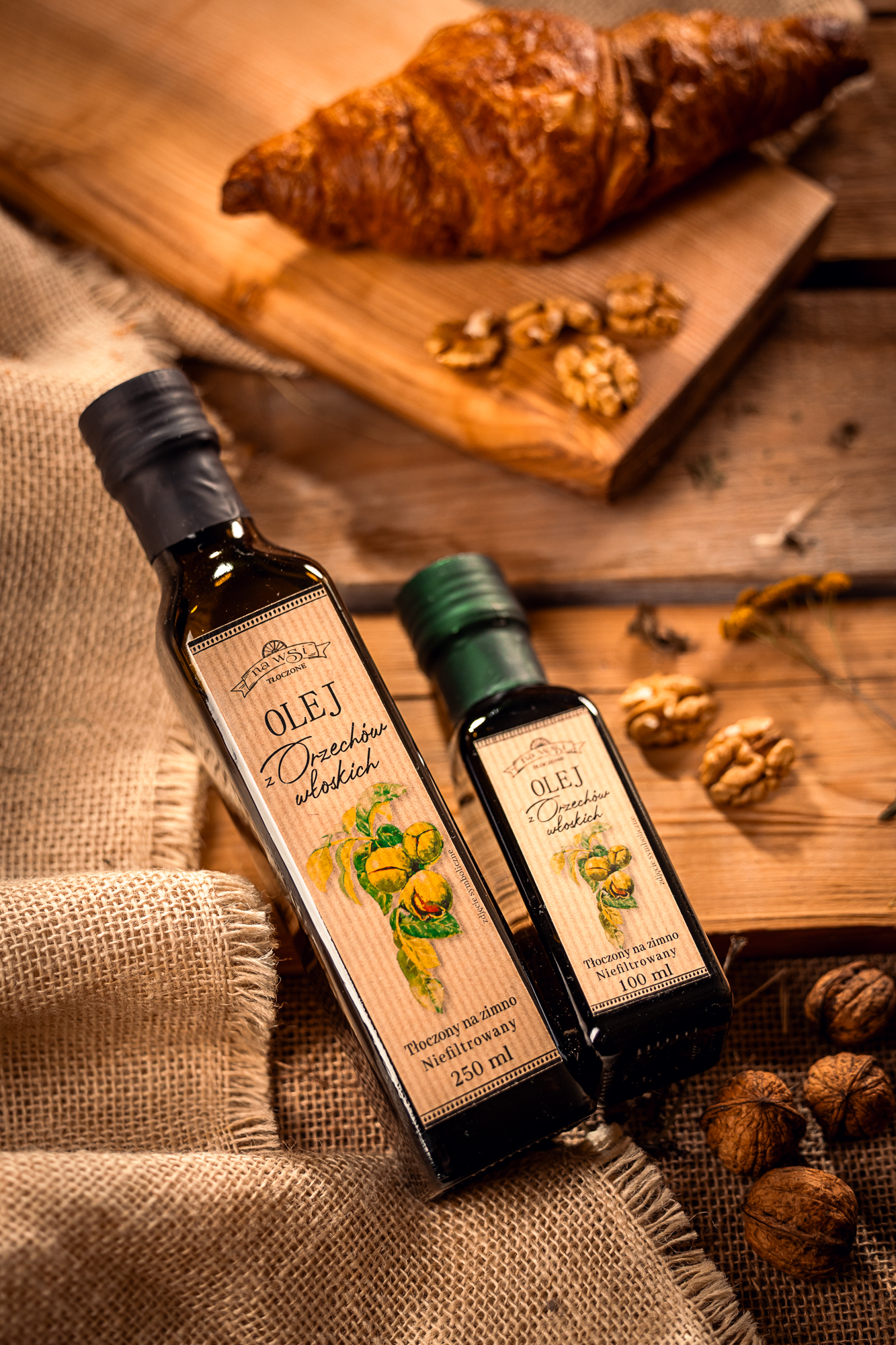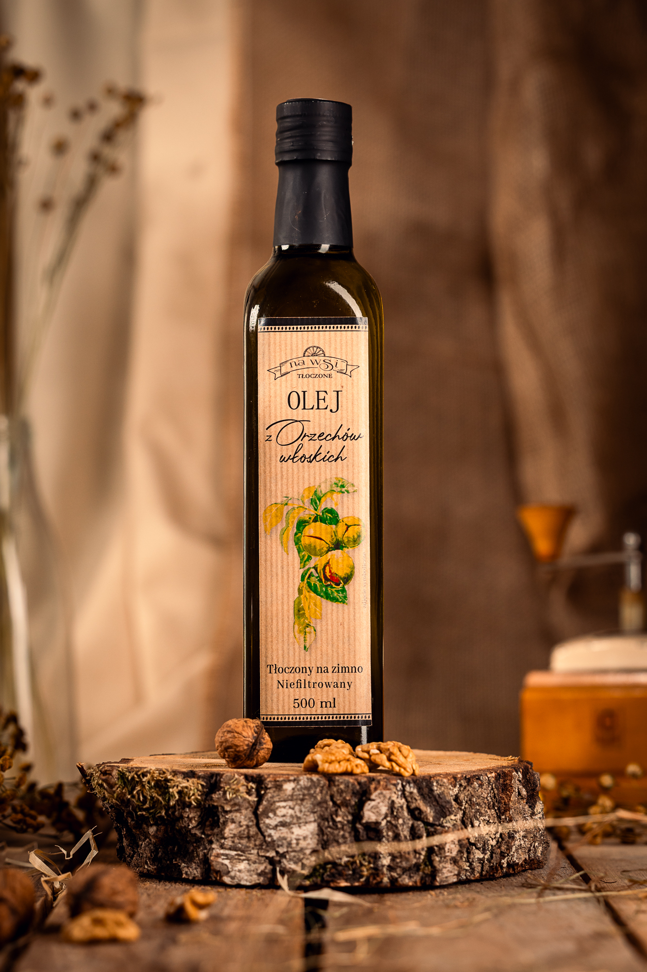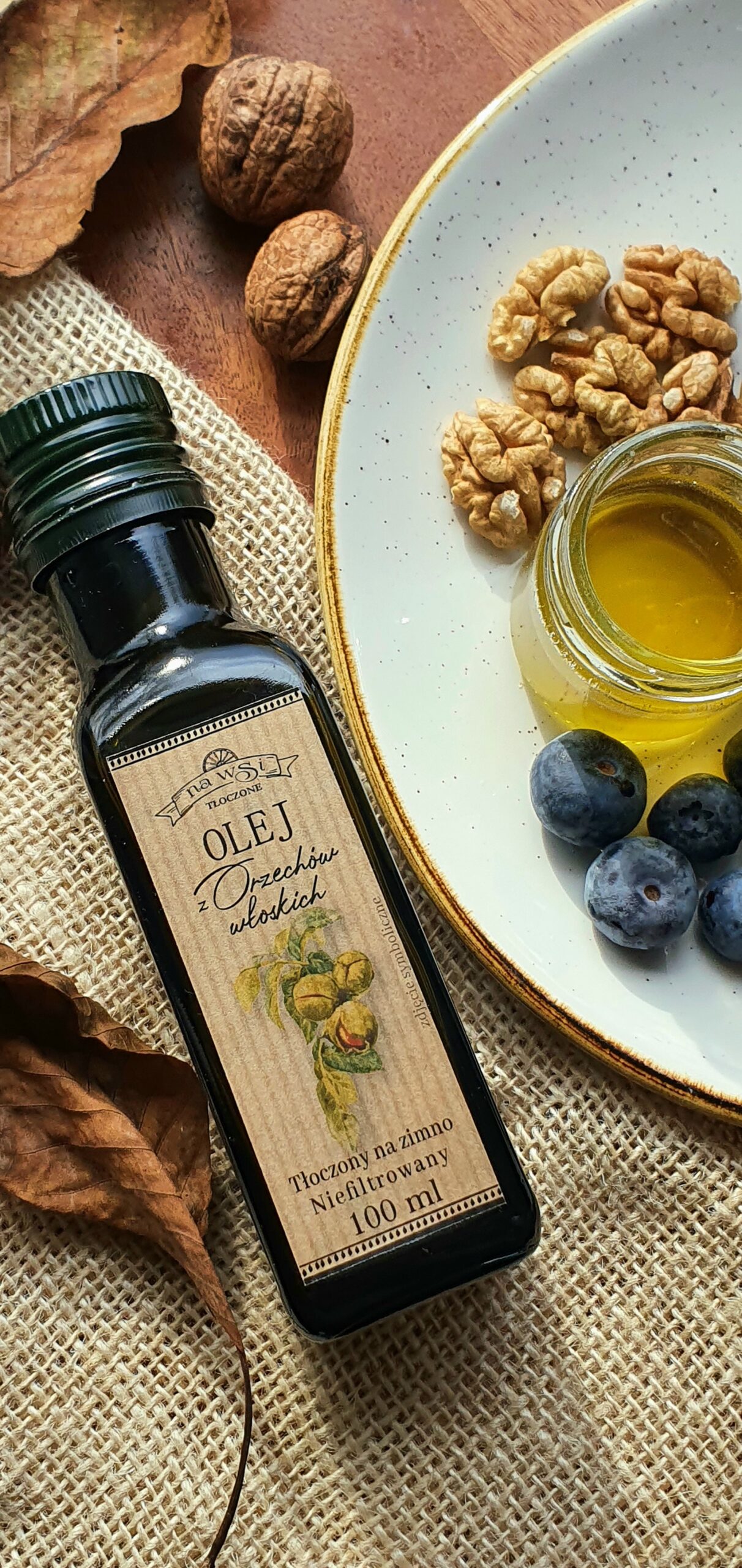 Naturalny olej tłoczony na zimno z nieprażonych orzechów włoskich. Swoisty orzechowy, słodkawy smak, złota barwa, delikatnie mętny. Smak wyraźny – intensywny, ale zarazem delikatny, dobrze wyczuwalne orzechy włoskie. Obłędny. Oryginalny i wyszukany dodatek w kuchni, który sprawdzi się na wytrawnie oraz jako dodatek do deserów. Bogaty w nienasycone kwasy tłuszczowe, zawiera wysoką zawartość kwasów omega 3, dostarcza witamin A, z grupy B oraz witaminę E. Wspiera układ nerwowy, wspomaga w regulacji glukozy we krwi.
